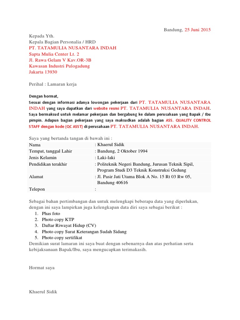 Demikian surat lamaran pekerjaan ini saya buat. Untuk bagian tertentu pasti nya dan bagian bagian di dalam pekerjaan nya. Isi dan sistematika surat lamaran pekerjaan meliputi tempat dan tanggal pembuatan surat, lampiran dan perihal, alamat surat, salam pembuka, alinea pembuka, isi. Pada hari senin, jumlah pekerja bagian produksi masih tetap. Rencananya kapasitas pabrik di brebes akan jauh lebih besar.